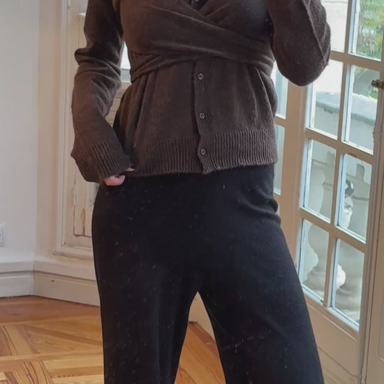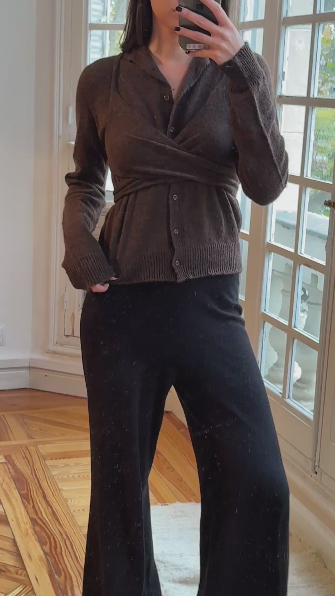 Two-in-one brown tricot—wrap front stitched over a buttoned base. Mini collar, long sleeves, waist-skimming rib hem