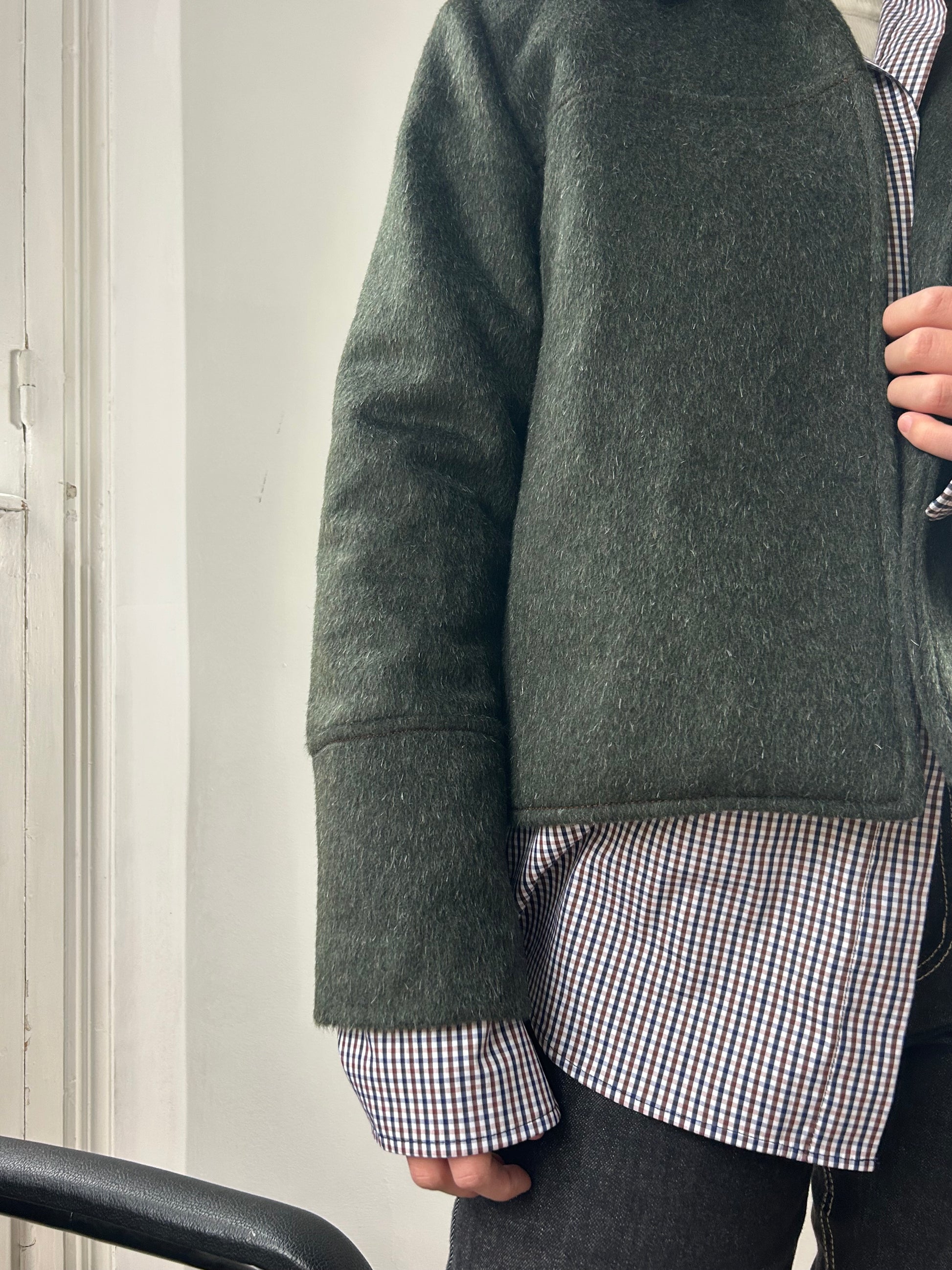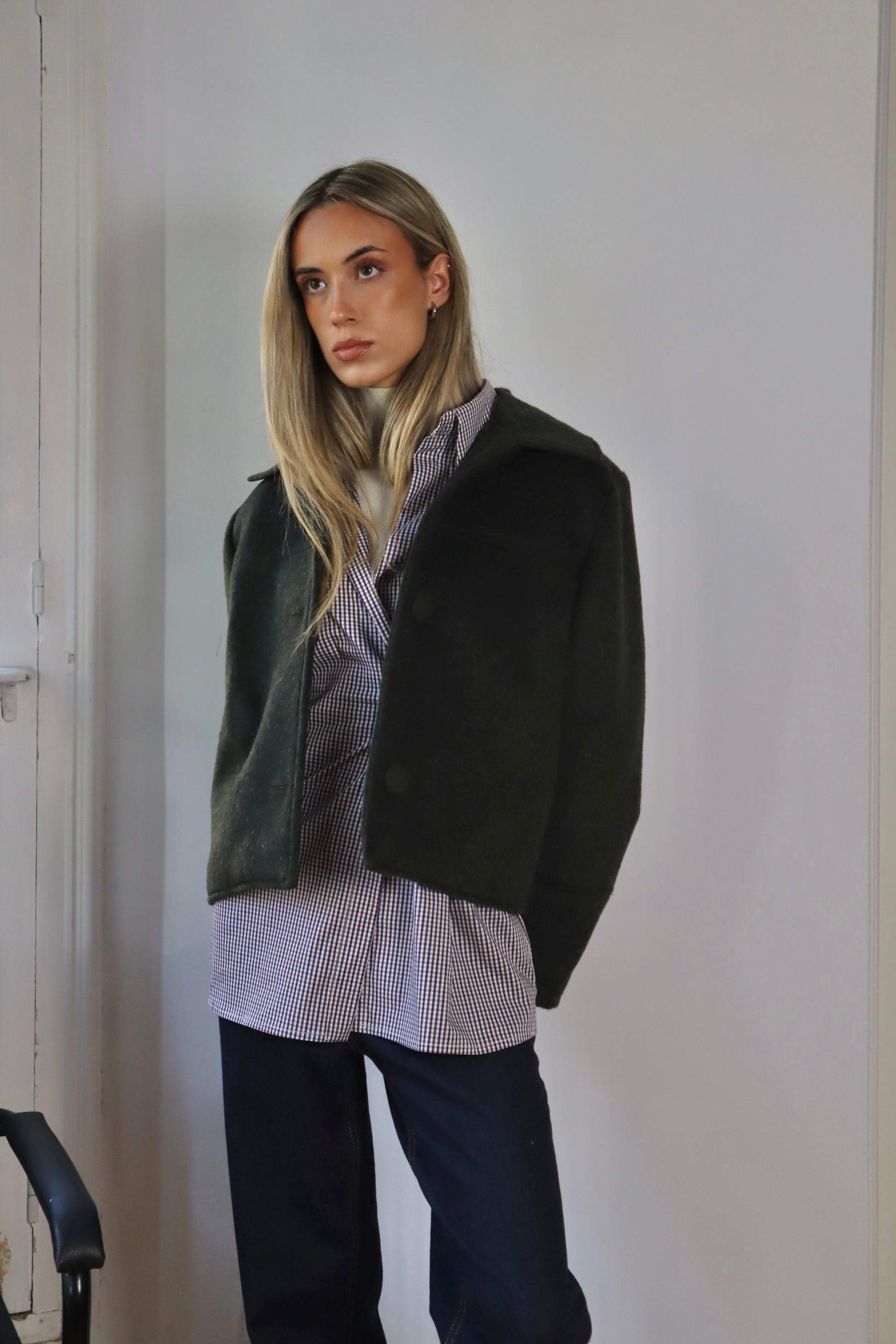 A modern take on a timeless silhouette. This cropped wool jacket brings understated sophistication with its clean lines and structured shape. The rich dark hue and soft, textured fabric make it an essential layering piece for effortless everyday style.