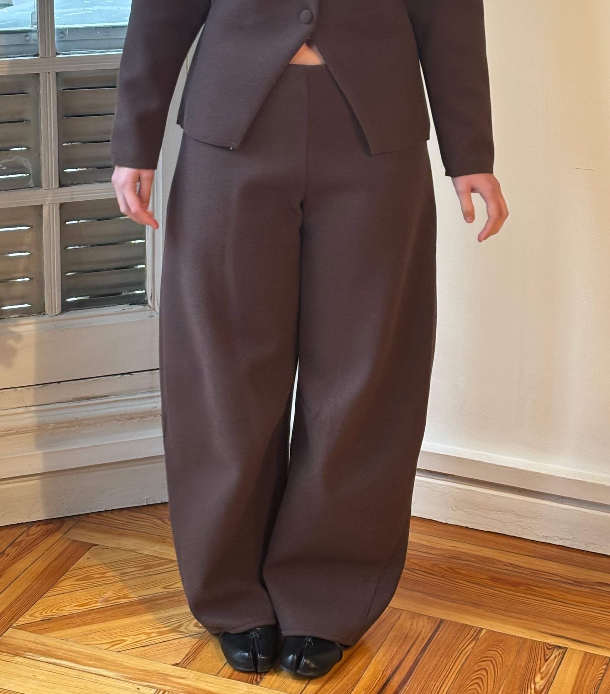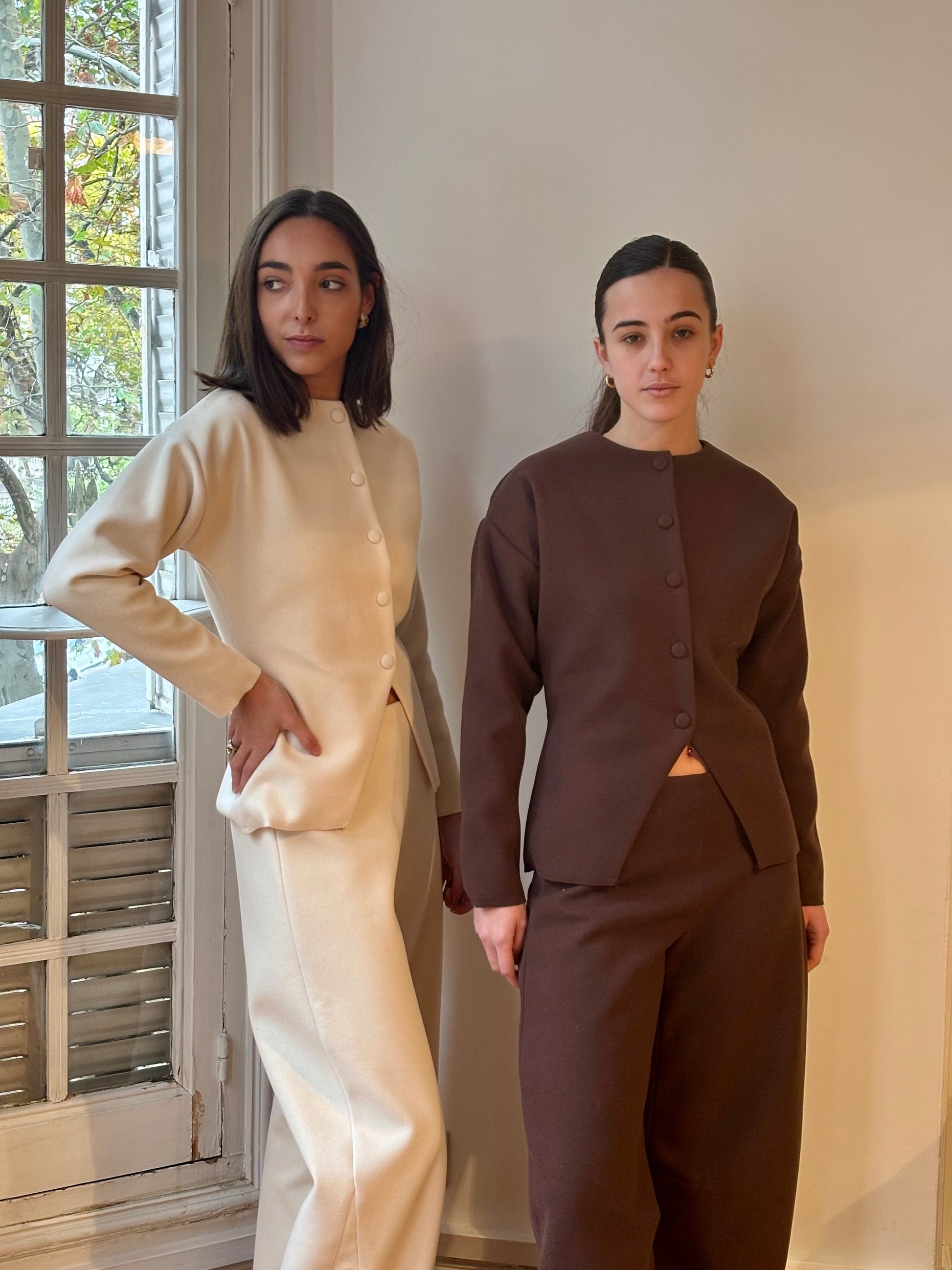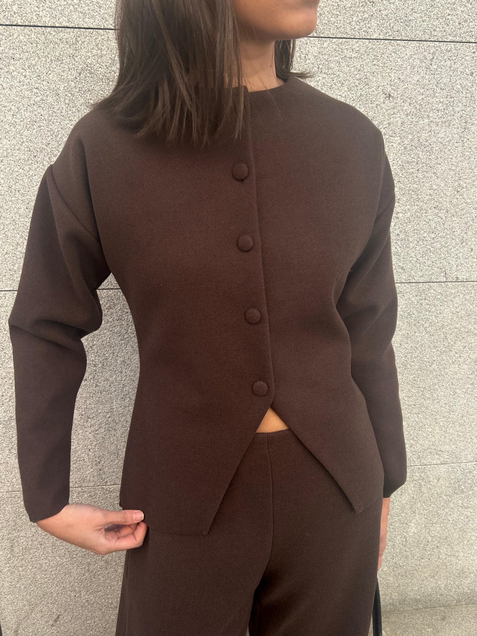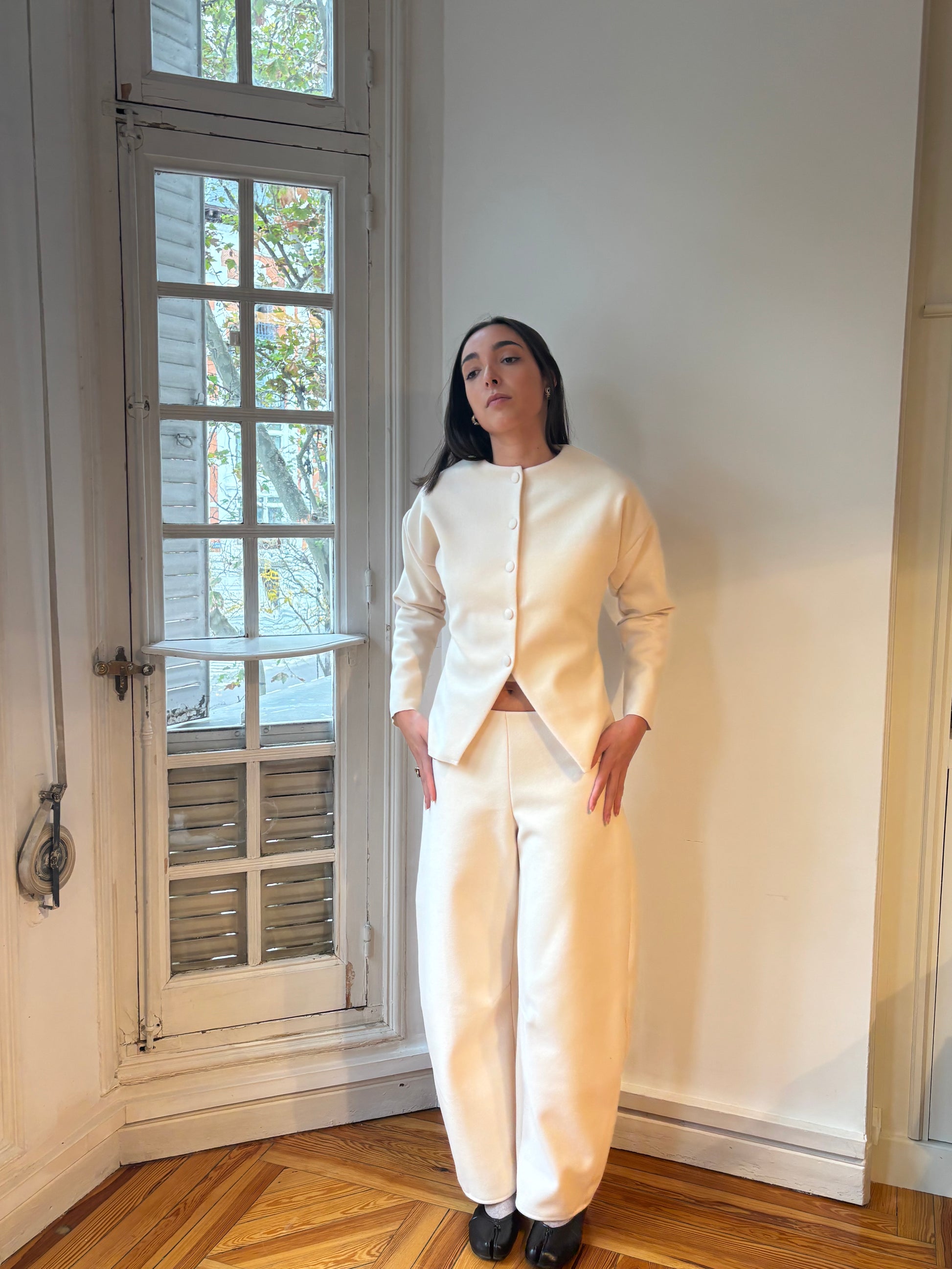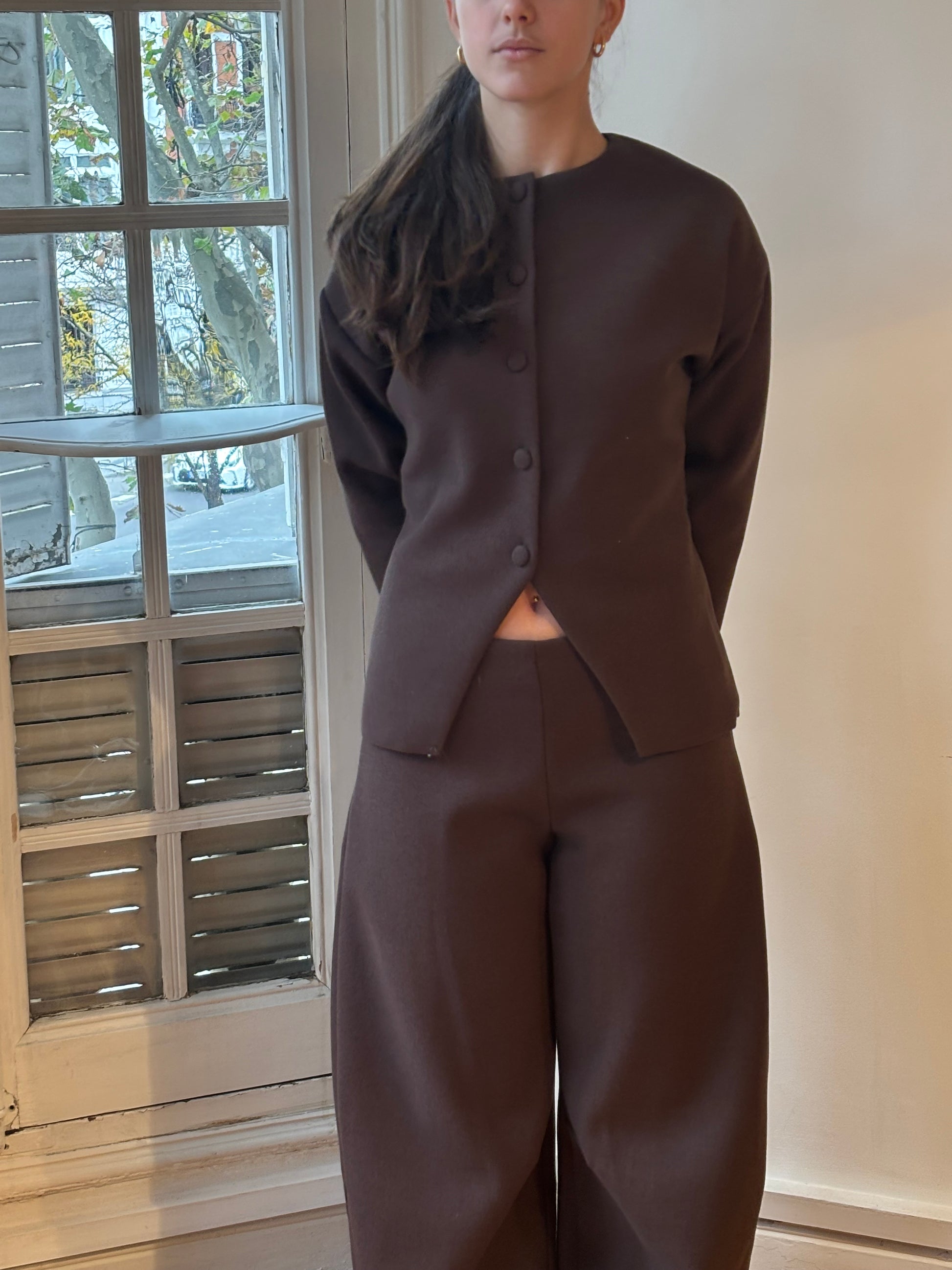 Made from a soft fabric with a clean. The top features a fitted waist, front buttons, and a small opening at the hem. The pants have a balloon leg and a mid-rise fit. A minimal white or chocolate brown set that feels polished but easy to wear.