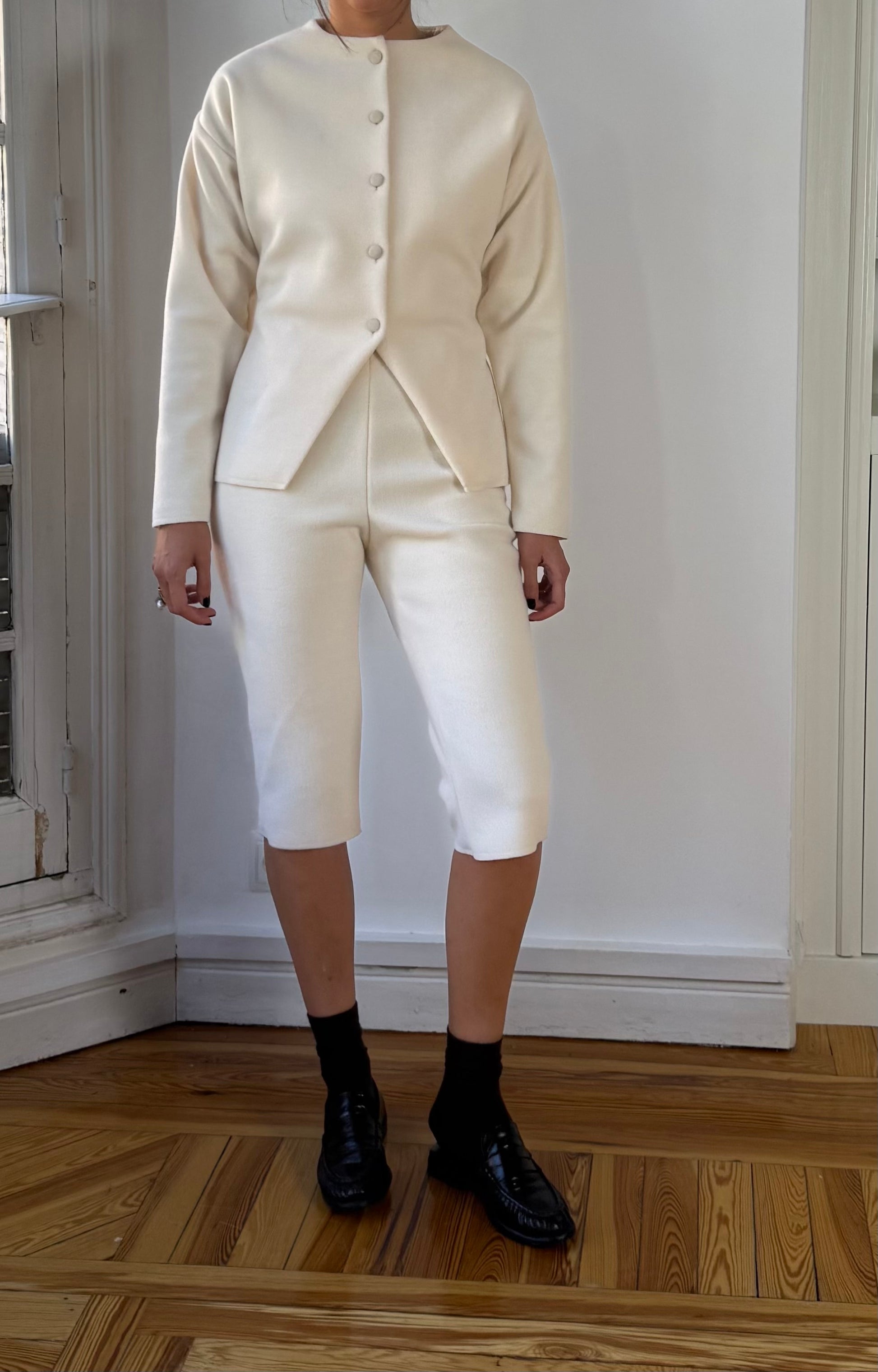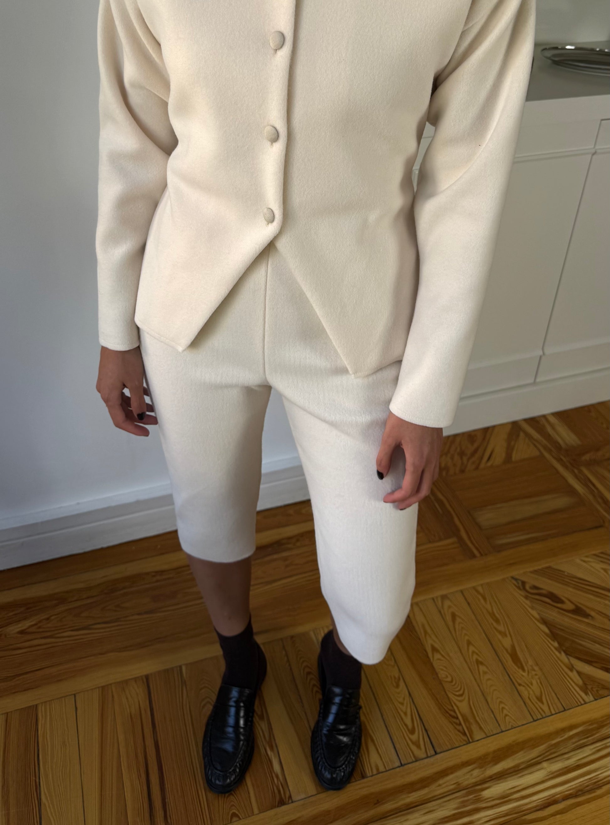 Atemporales y refinados, estos pantalones de sastre color crema presentan una silueta minimalista diseñada para la sofisticación del día a día. Confeccionados con un tejido suave pero estructurado, ofrecen un favorecedor corte recto con un volumen sutil y líneas limpias.
