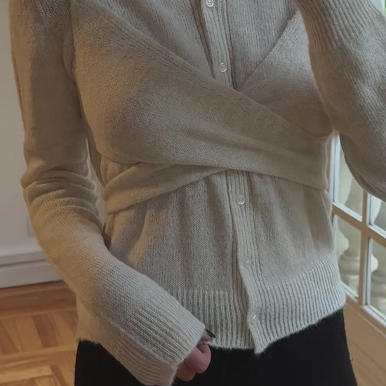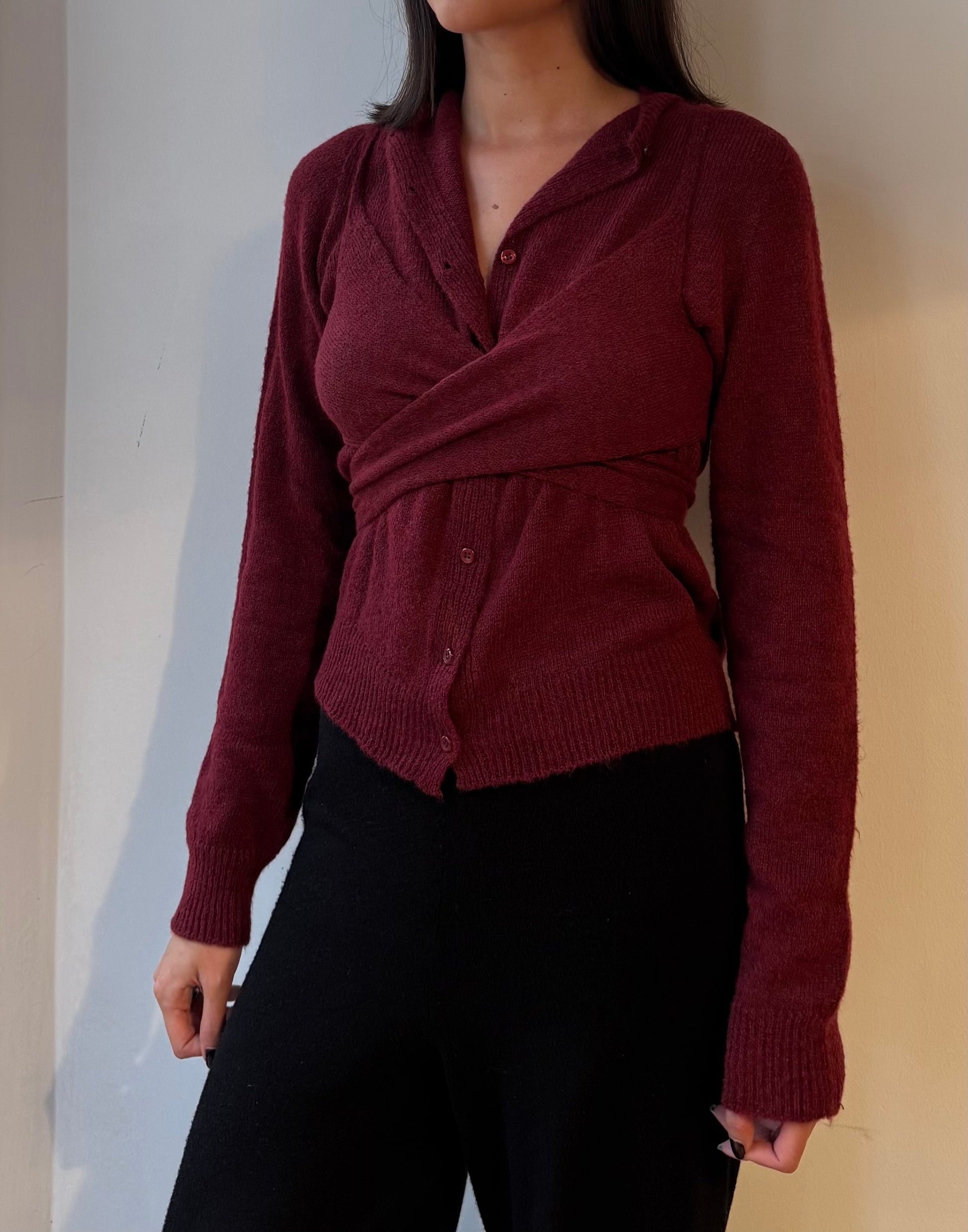 Two-in-one tricot: wrap look on top, buttoned body beneath. Mini collar and long sleeves balance the cropped rib finish. Slides from denim to tailored trousers without a rethink.